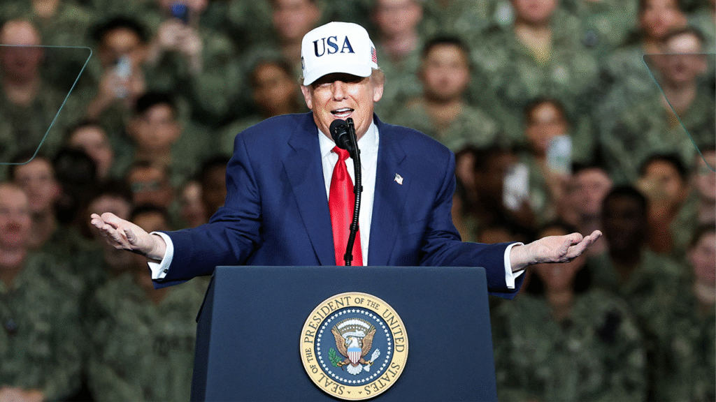U.S. President Donald Trump makes a speech on the aircraft carrier USS George Washington during his visit to the U.S. Navy’s Yokosuka base in Yokosuka, Japan, October 28, 2025. (REUTERS/Kim Kyung-Hoon)